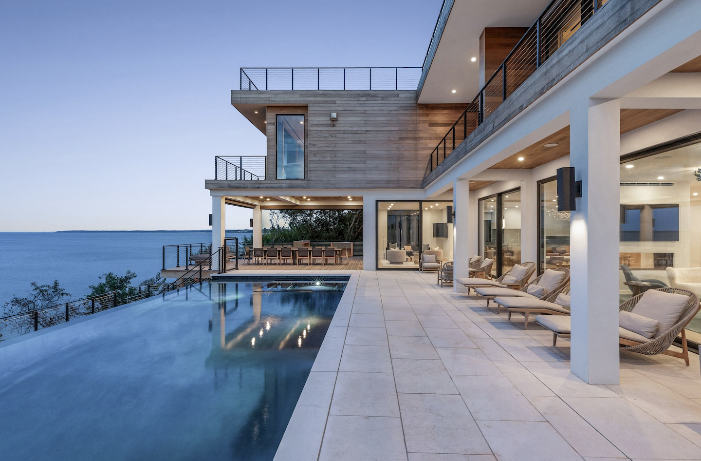 In winter 2023, we began work on a 10,000-square-foot modern home in Hampton Bays — Perched on a cliff, the house reads like a ship hovering over the water, with axial views and protected sightlines throughout. The brief: minimalism with chromatic confidence. We left neutral land for a taupe Bellini sofa, an Eskayel rug that becomes the art, and kitchen slabs of green-blue quartzite — spectacular veining, leathered finish. Blue grasscloth, rich mohair, and candy-bright glass tables add controlled saturation. Discipline keeps it serene: clean reveals, organic and muted fixed materials, consistent shadow gaps, and restrained case goods that draw the eye toward the bay. Nature leads; the interiors follow. The result is half statement piece, half sanctuary — now home to a very happy family of five.